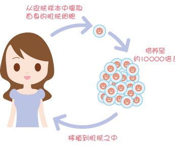 所以,使用皮肤细胞的再生医疗是对因老化而减少了的皮肤细胞进行移植和补充,起到真正改善“皱纹”“皮肤下垂”的效果。此项皮肤细胞移植和补充疗法,不会如玻尿酸那样通过扩张皮肤表面的凹沟来修整“皱纹”“皮肤下垂”,而是从导致“皱纹”“皮肤下垂”的根本原因着手,解决皮肤老化(细胞减少)的问题,从而改善“皱纹”“皮肤下垂”。
